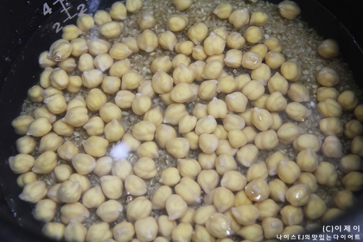 현미, 귀리, 컴트만으로 잡곡밥을 지어 먹는데 이번에는 병아리콩도 넣었습니다.병아리의 머리처럼 생겼다 하여 이름 붙여진 병아리콩은 지방 함량이 낮고 단백질, 칼슘이 풍부하다고 알려져 있습니다.